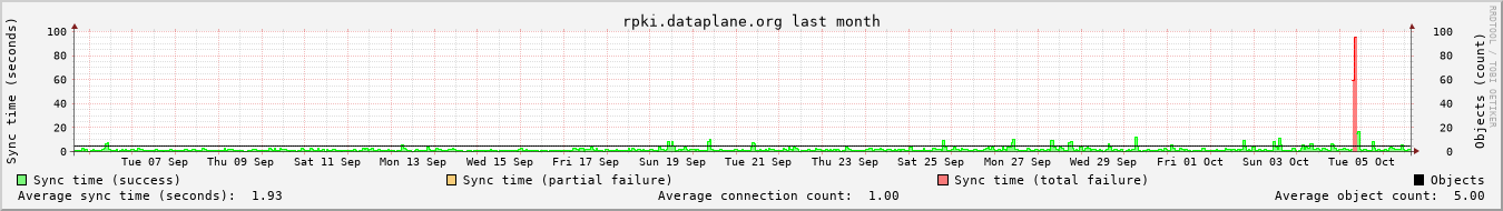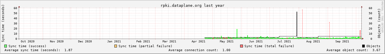 | certificate has expired | certificate revoked | RFC 3779 resource not subset of parent's resources | Bad CRL | Certificate failed validation | CRL issuer name mismatch | Malformed caDirectory URI | Object rejected | rsync transfer failed | Trust anchor key mismatch | Unreadable trust anchor | Nonconformant X.509 issuer name | Nonconformant X.509 subject name | Policy Qualifier CPS | rsync partial transfer | Skipped because not in manifest | Stale CRL or manifest | Tainted by stale CRL | Tainted by stale manifest | Trust anchor skipped | Object accepted | rsync transfer succeeded | |